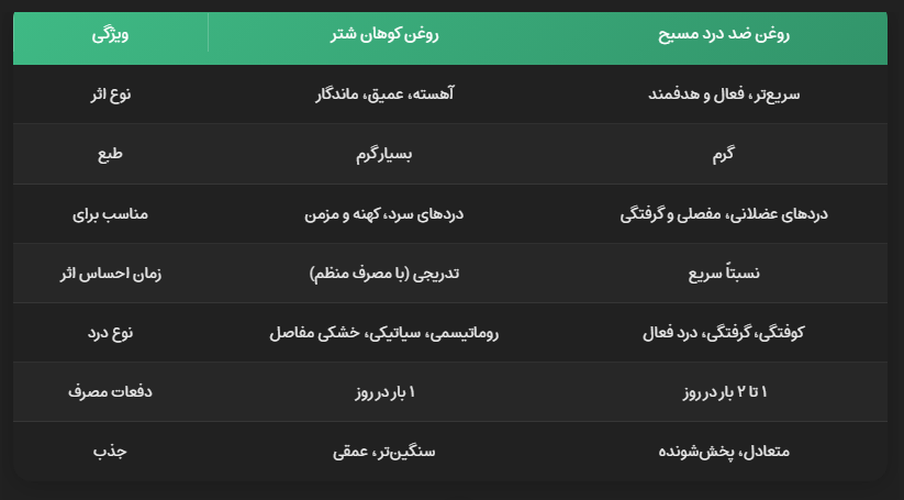 نکته: روغن کوهان شتر بیشتر برای دردهای عمیق و قدیمی کاربرد دارد و اثر آن تدریجی اما ماندگار است.